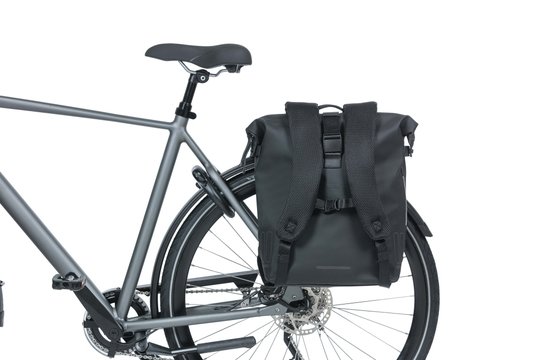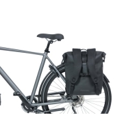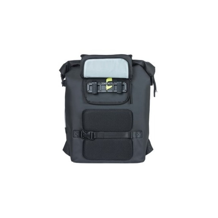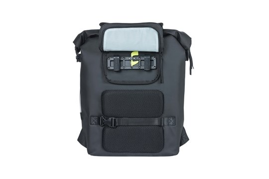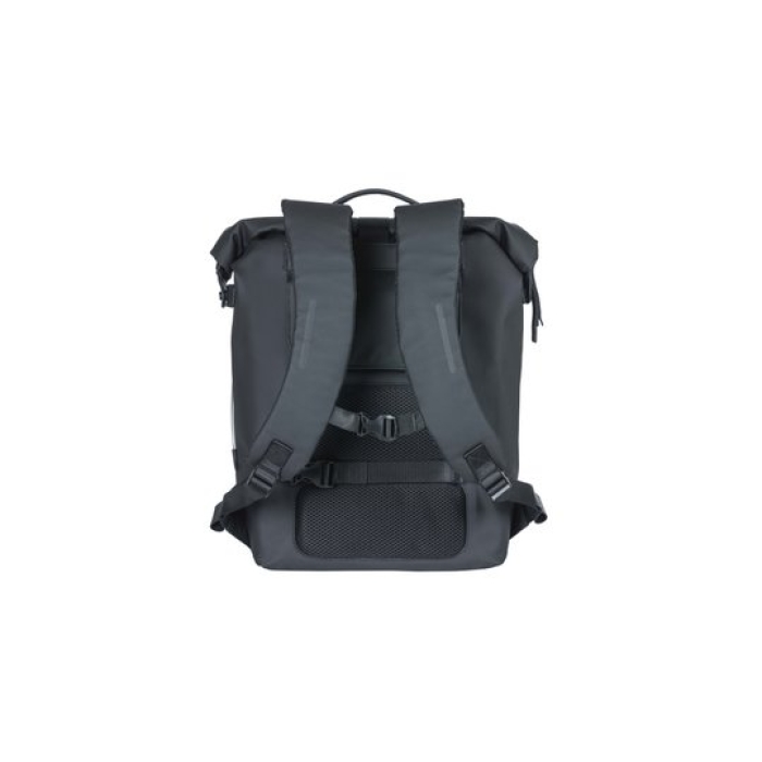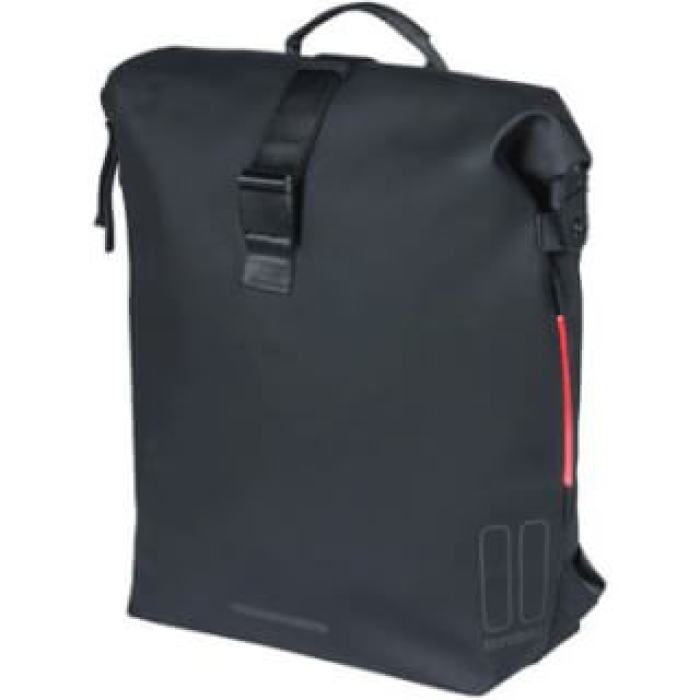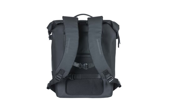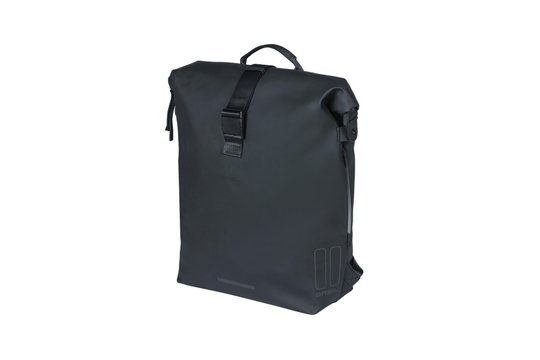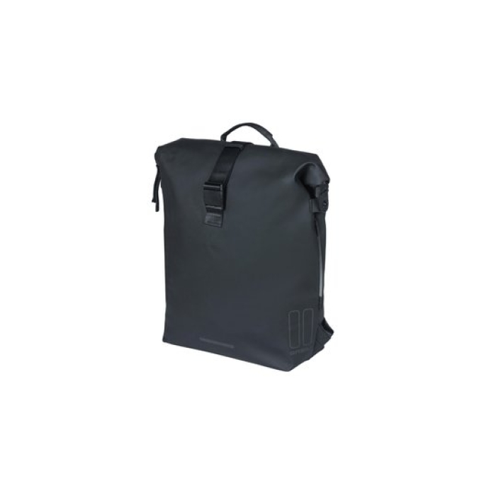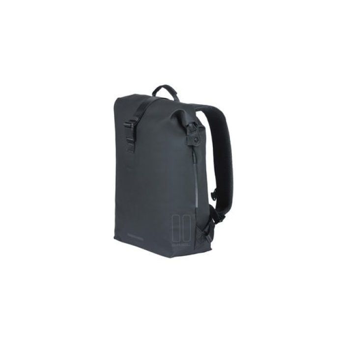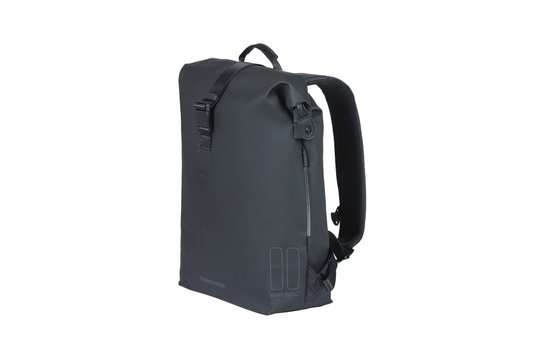 Basil SoHo fietsrugzak Nordlicht, waterdicht (IPX 3), PU, roltopsluiting met rits,drukknopen, Hook-On systeem, gewatteerde schouderbanden en achterpand, uitneembare neopreen laptop organizer 15.6 inch, Nordlicht LED (excl.batt.), refl.,17L,night zwart