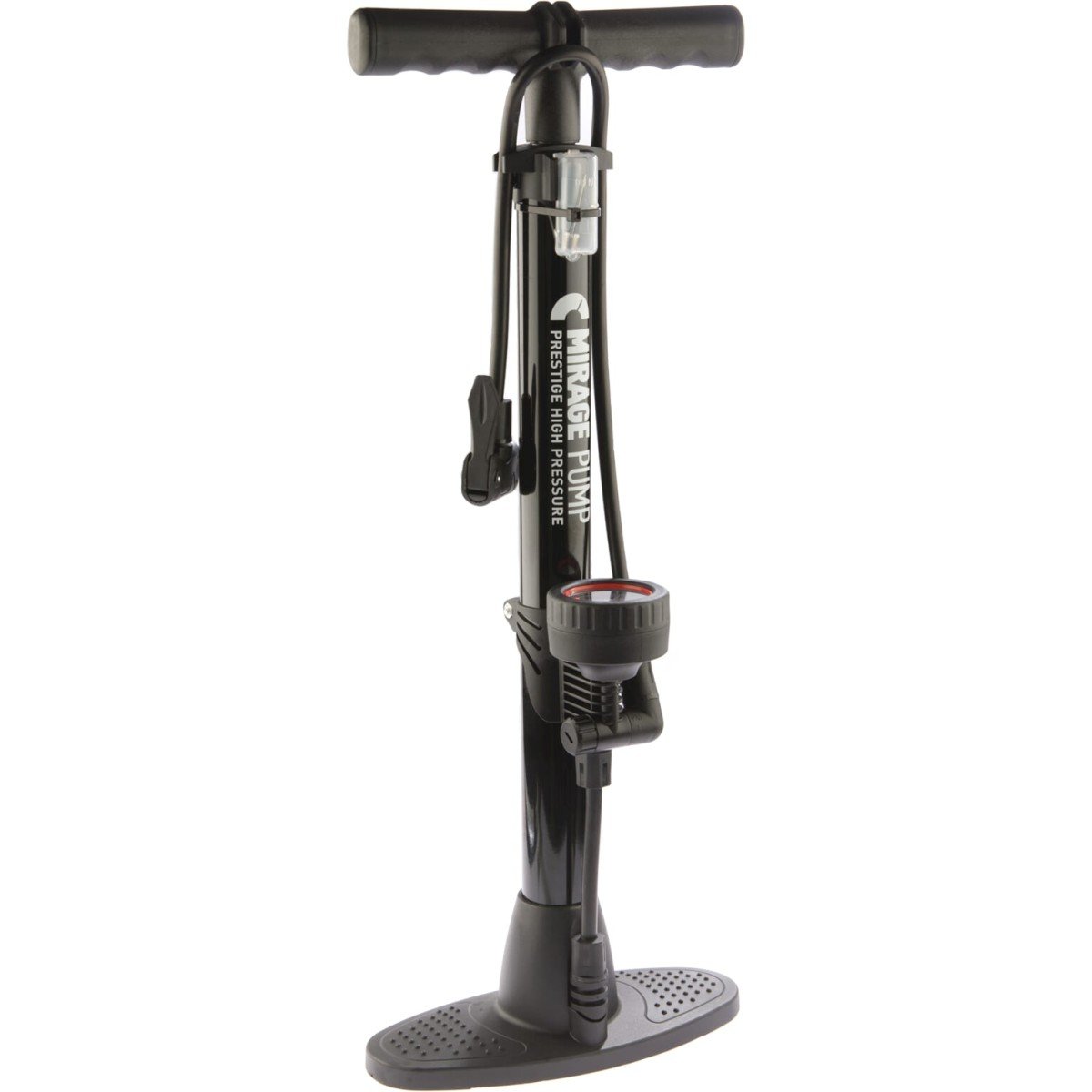 Mirage vloerpomp Prestige high pressure met meter, dualhead inclusief adapters Deze Mirage fietspomp is een pomp voor in elke schuur. Duurzaam materiaal maakt dat deze fietspomp lang meegaat. Mirage denkt aan alles, dus een bal oppompen kan ook met deze fietspomp; gebruik daarvoor de balnippel in het kleinste gat van de dualhead. Het Presta ventiel is ook geen probleem voor deze Mirage fietspomp: draai het bovenste moertje voorzichtig los en draai de meegeleverde adapter voor het Frans ventiel erop. Met de Mirage fietspomp is deze band dan zo opgepompt. De Mirage fietspomp kan een hoge druk aan; dus ook de racefietsband kan opgepompt worden met deze Mirage fietspomp.