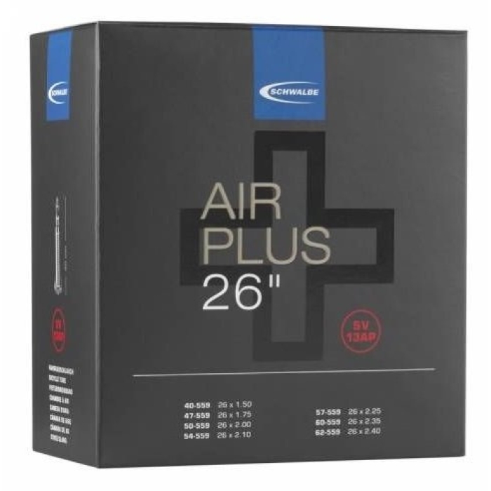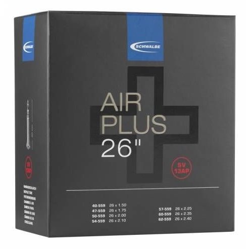 Schwalbe binnenband Air Plus 26 inch 40/62-559 Frans ventiel, houdt langer de lucht vast, Door het hoge zuivere butylaandeel houdt de Schwalbe Air Plus binnenband de lucht beduidend langer vast. Hierdoor hoeft minder vaak bijgepompt te worden. hogere lekbescherming Dankzij de dikkere wandsterkte is de Schwalbe Air Plus bijzonder robuust en daardoor zeer goed beschermd tegen lekrijden. Wanneer de Schwalbe Air Plus alsnog vervangen moet worden is deze evenals alle andere Schwalbe binnenbanden 100% recyclebaar. Ideaal voor E-Bike en Cargo bikes.